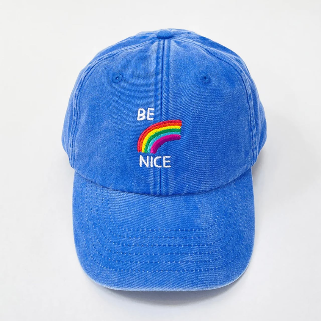 ヴィンテージブルーのデニムキャップに「Be Nice」のレインボーアートワークが刺繍されています。シュリグリーのシルクスクリーン作品をアレンジ・デザインしたキャップです。