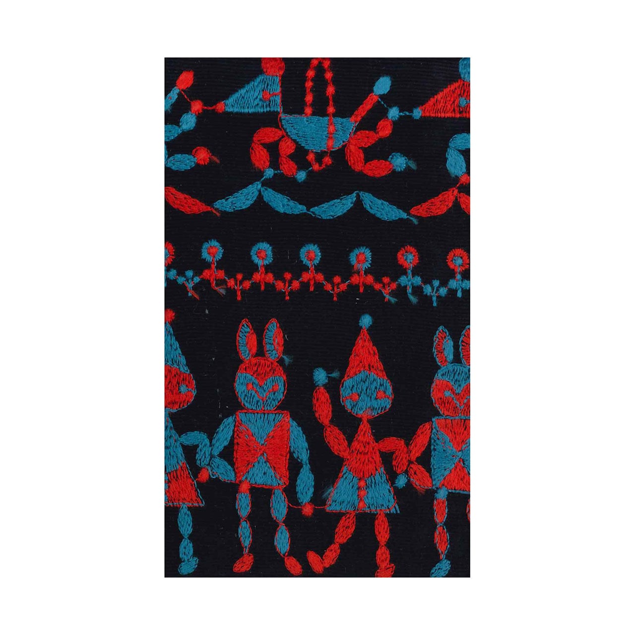 おもちゃ箱から抜け出したパペット やどうぶつたちがリズミカルに踊り ながら自由に楽しんでいる様子が 刺繍で表現されています。