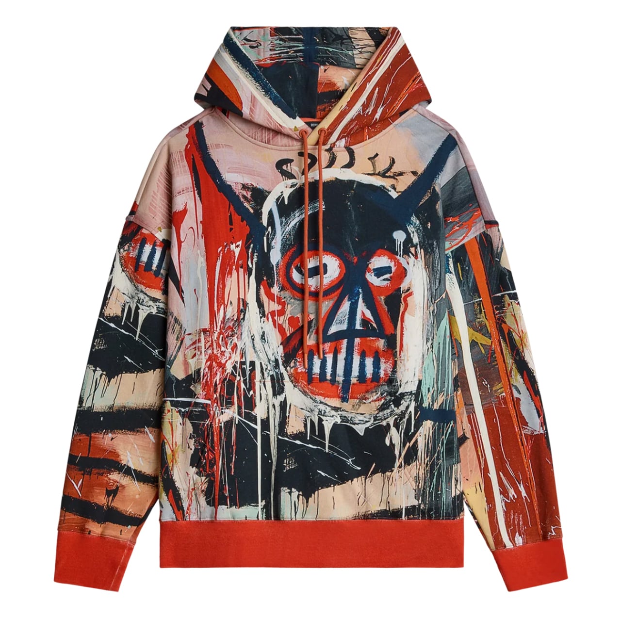 このオールオーバープリントのミディアムフリースフーディーには、バスキアの1982年作『無題(悪魔)』のアートワークがプリントされています。