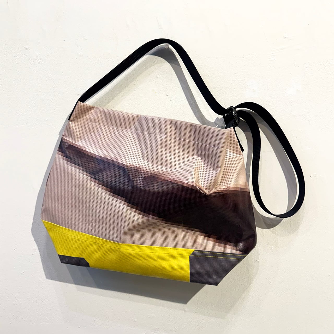 このバッグは、現場にかけられていたタープを再利用した100%リユース素材で製作されています。一点一点が全て異なる柄をまとったユニークなプロダクトになります。普段使いもしやすいベーシックかつタフなハンドメイドのスリングバッグです。