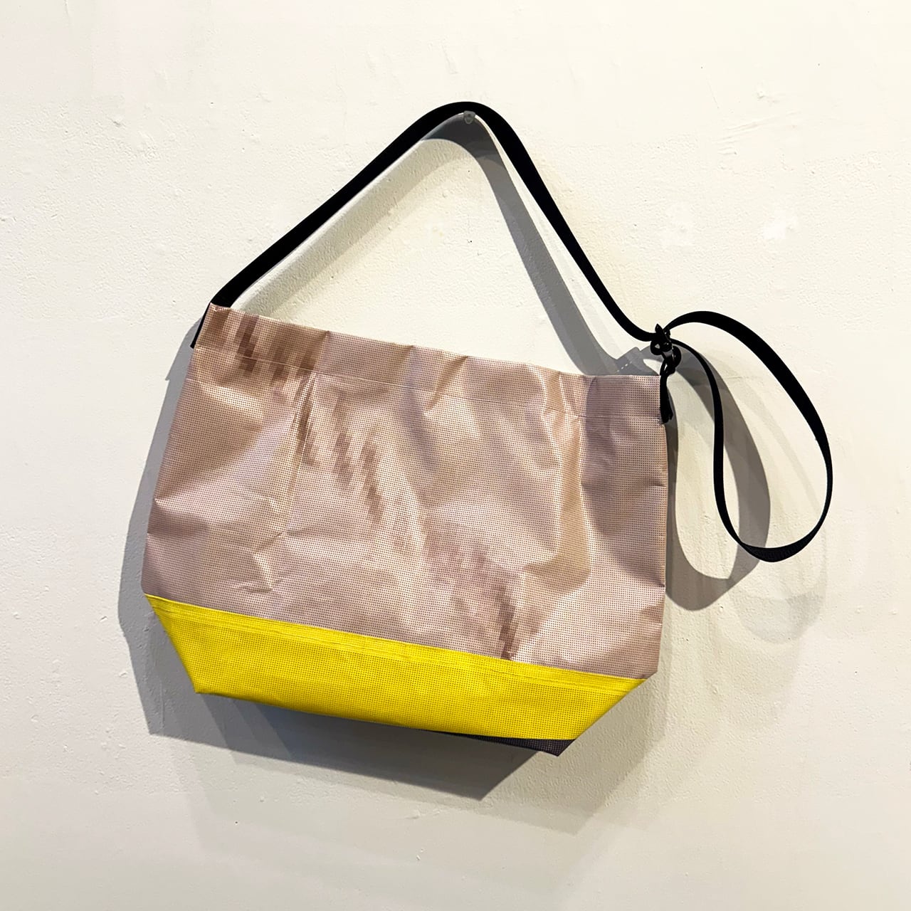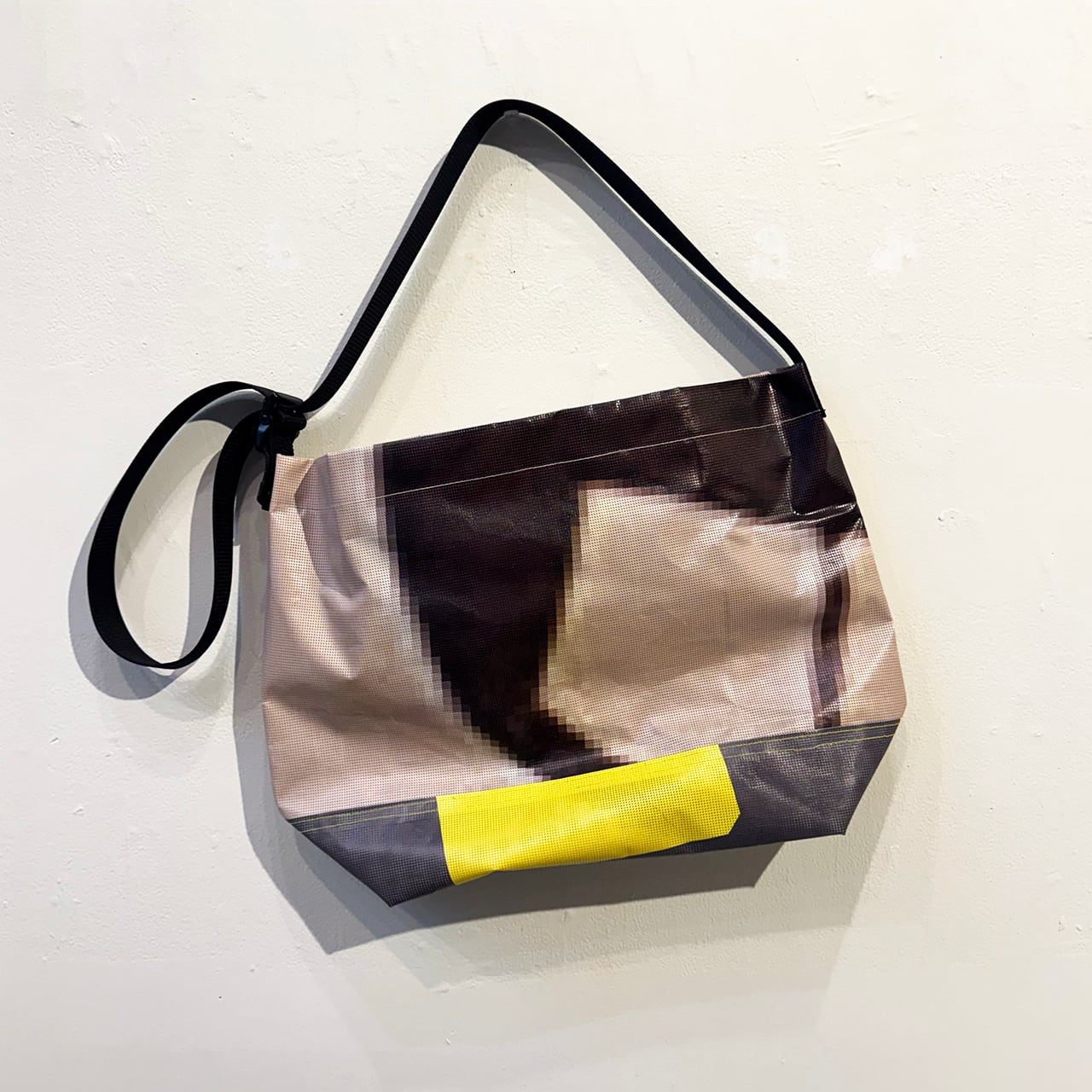 このバッグは、現場にかけられていたタープを再利用した100%リユース素材で製作されています。一点一点が全て異なる柄をまとったユニークなプロダクトになります。普段使いもしやすいベーシックかつタフなハンドメイドのスリングバッグです。