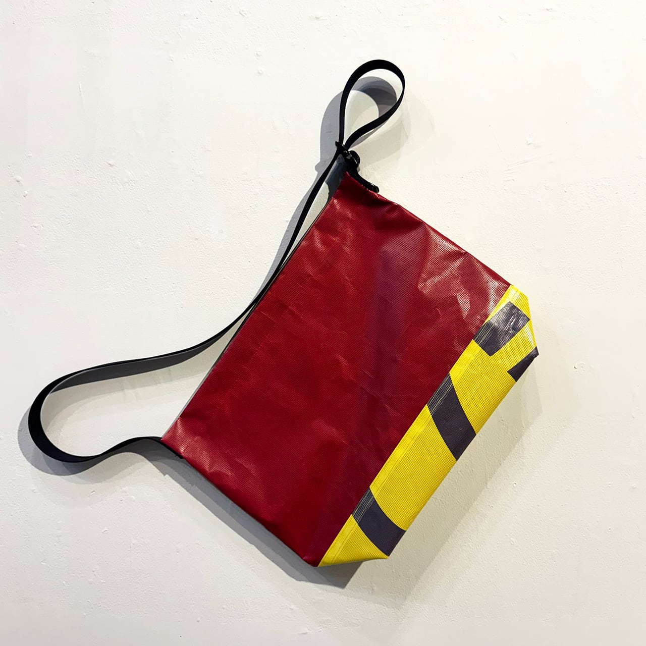 このバッグは、現場にかけられていたタープを再利用した100%リユース素材で製作されています。一点一点が全て異なる柄をまとったユニークなプロダクトになります。普段使いもしやすいベーシックかつタフなハンドメイドのスリングバッグです。
