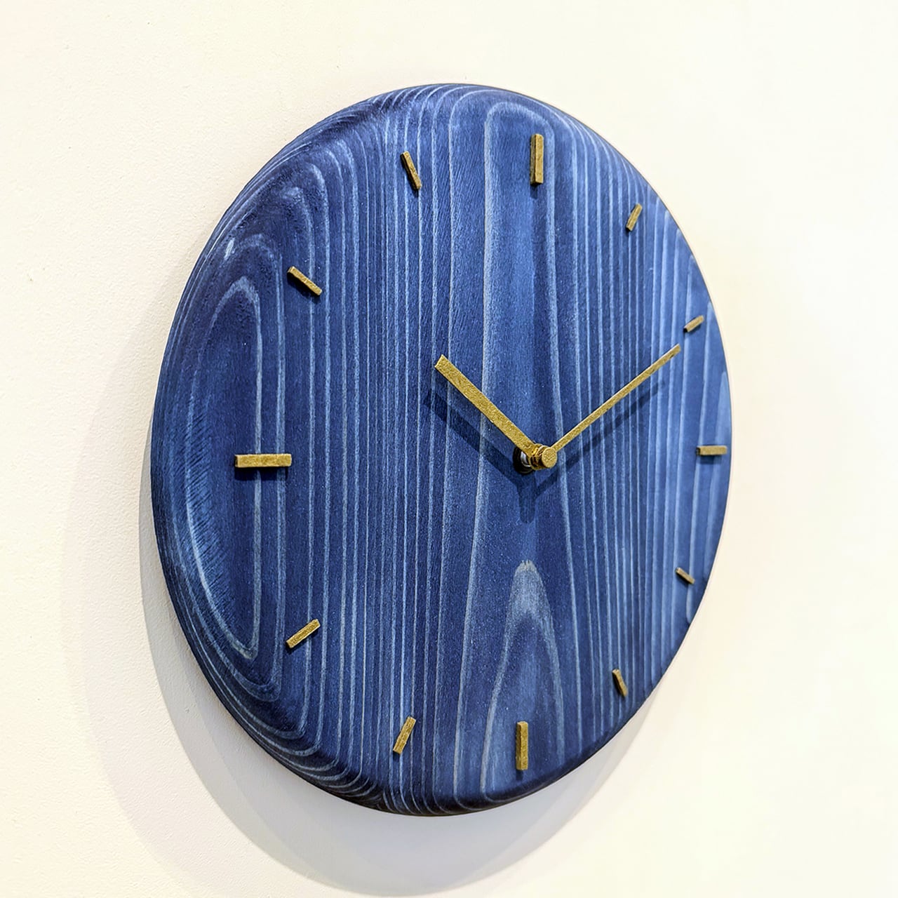 本体木部は、藍染めにより美しい青を 表現し、文字盤と針部分は木とアルミを 金属風の特殊な仕上げを施し、 凹凸ある風合いを意図しました。