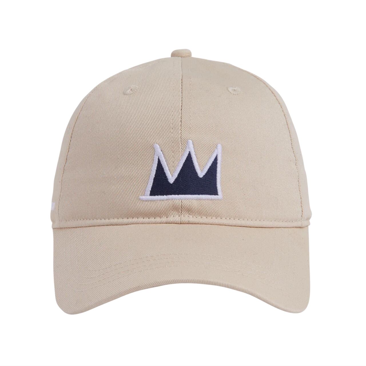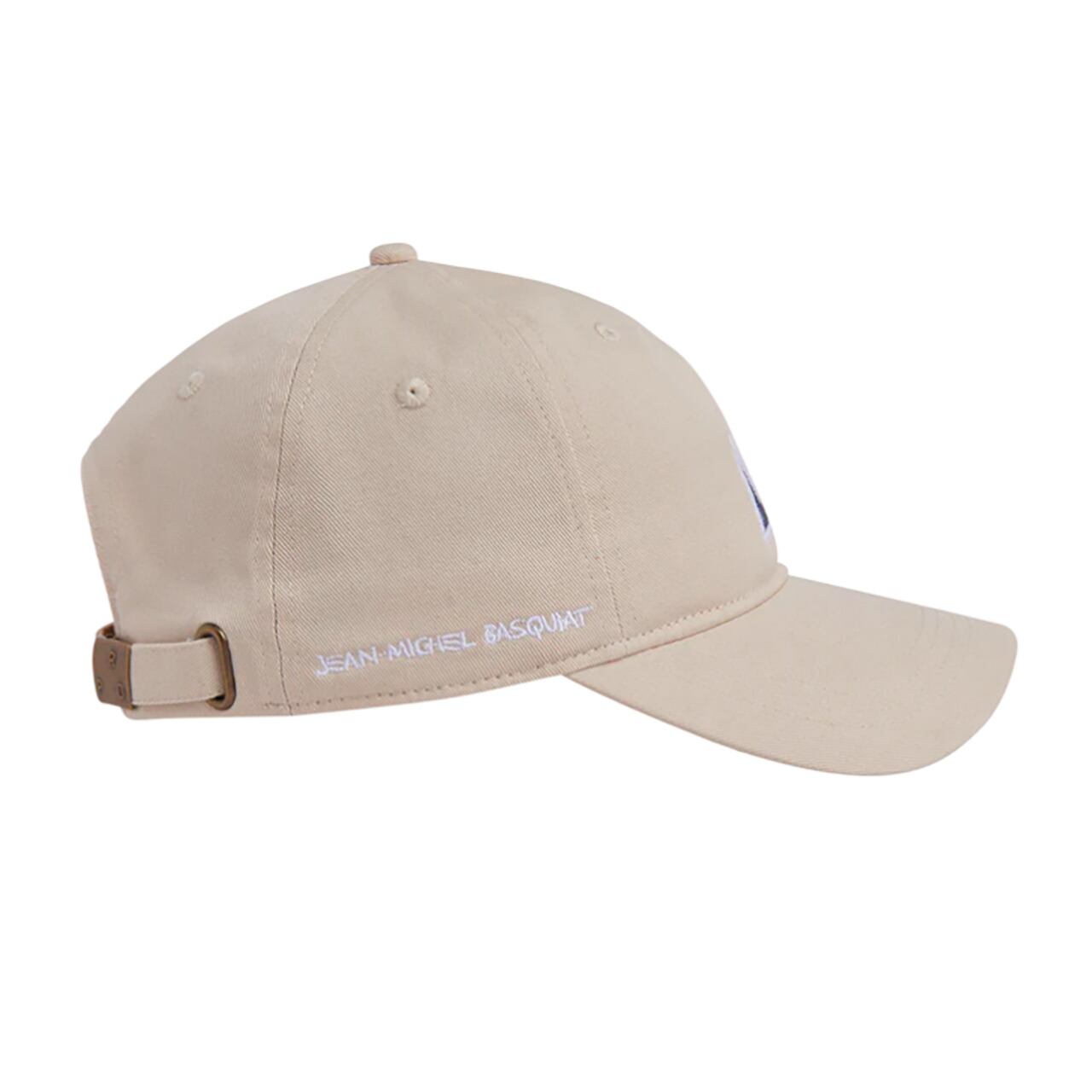 この100%コットンツイル製のダッドキャップは、前面にバスキアの象徴的な金色の王冠モチーフが刺繍され、バックルストラップでフィット感を調整できます。