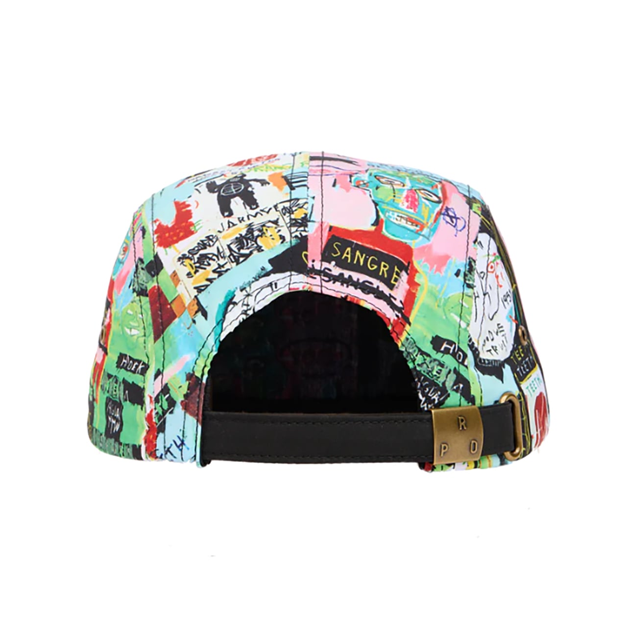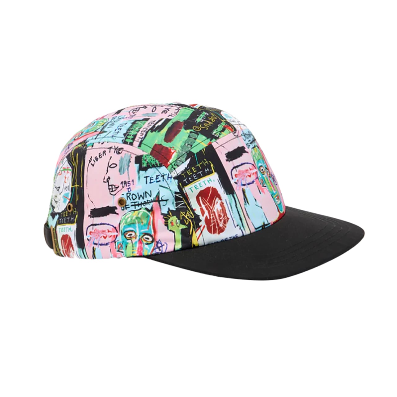 この100%コットンツイルの5パネルキャップには、ジャン=ミシェル・バスキアの「In Italian」が全面プリントされています。