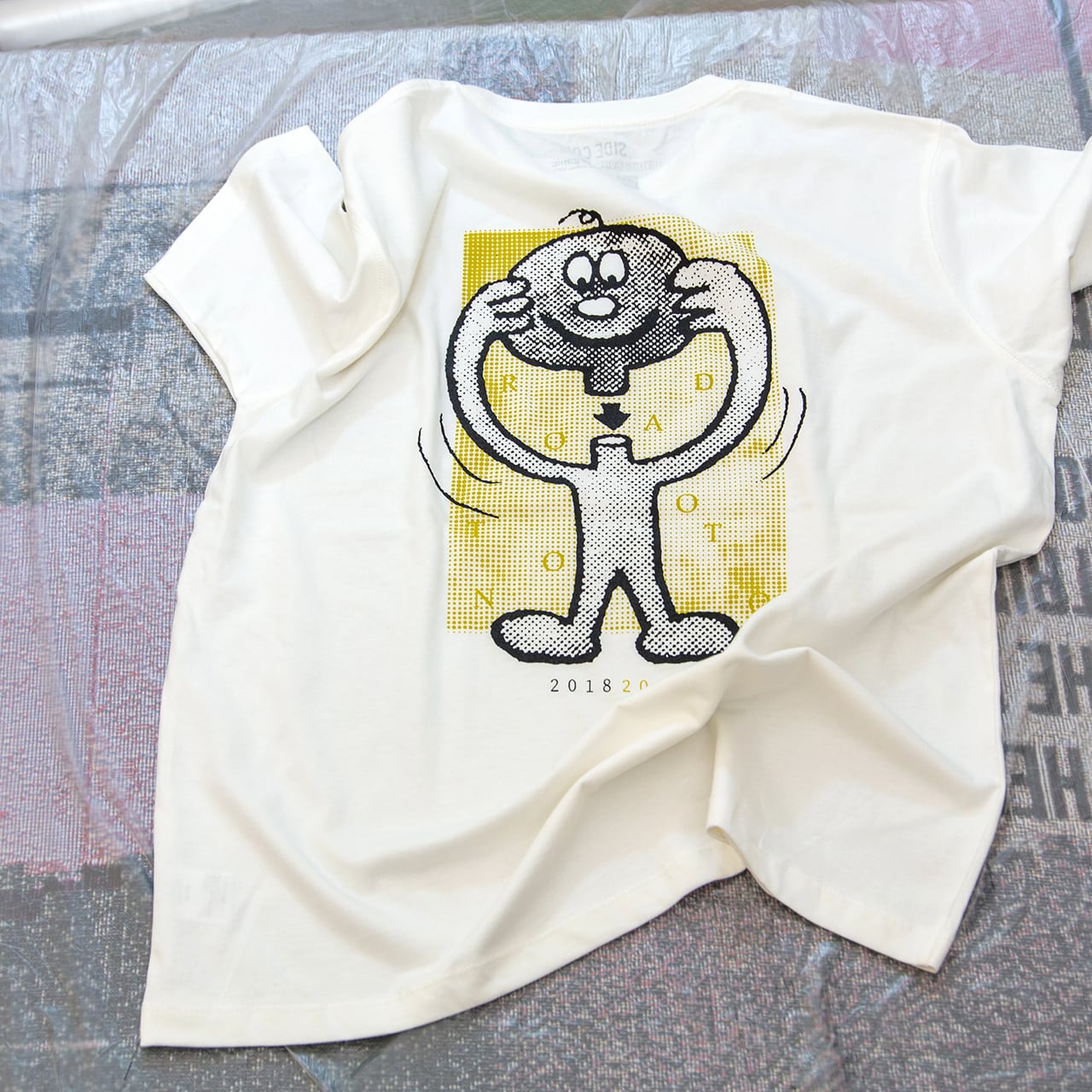 細野はどの街にもある少し古くて可愛い謎のキャラクターをサンプリングし、コラージュする独自の手法。フロントプリントは珠洲で見かけた風景を、バックプリントは滞在中に図書室で見つけたキャラクターをもとに制作されています。このTシャツのユーモラスなフォルムと静かな違和感。能登への“道”を象徴するように、人と風景、記号と身体が軽やかに交錯します。シンプルな線の中に、日常と非日常の境界が滲む一枚です。