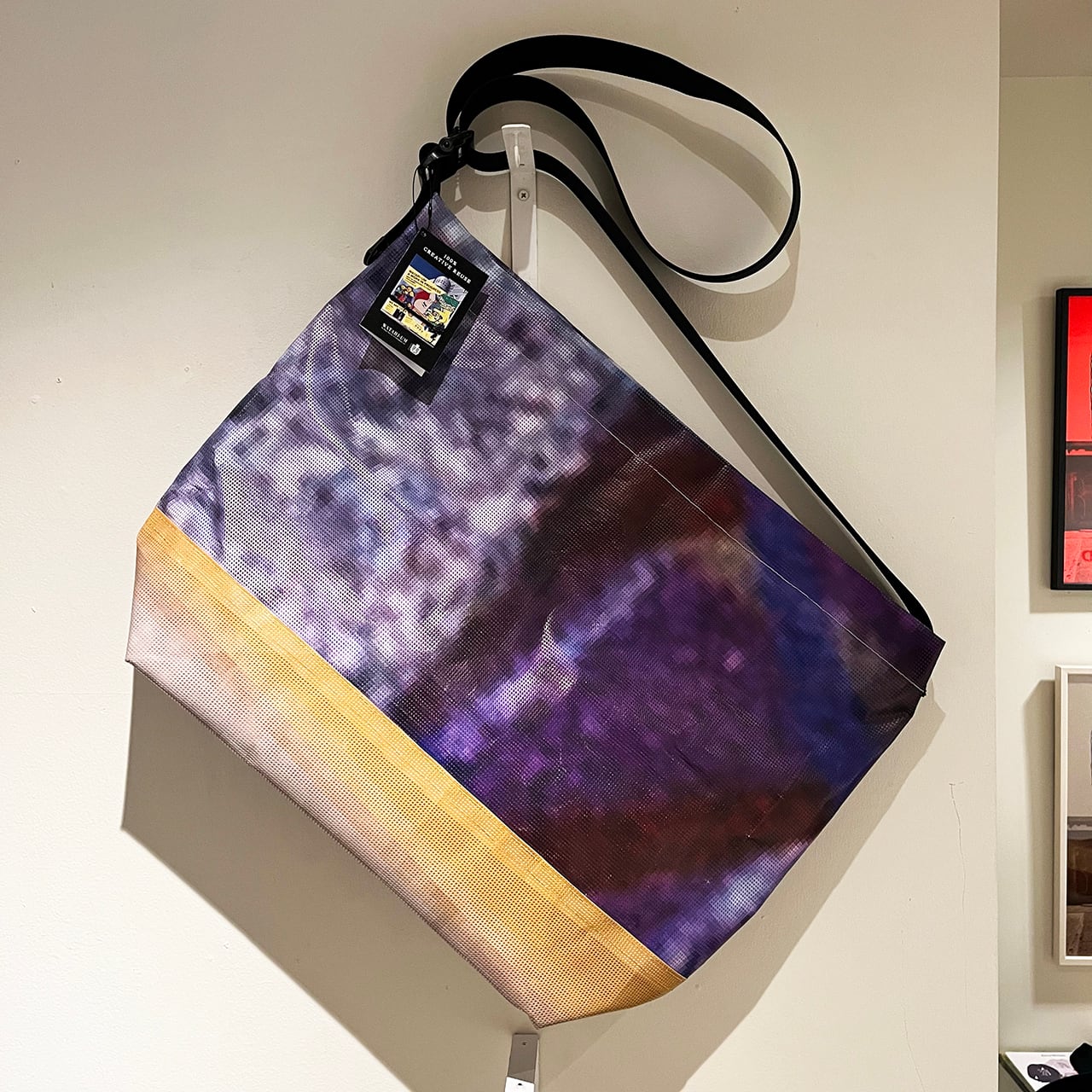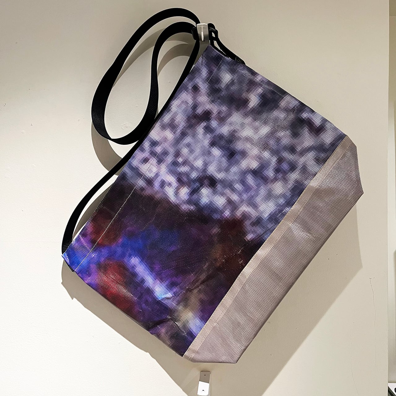 このバッグは、現場にかけられていたタープを再利用した100%リユース素材で製作されています。一点一点が全て異なる柄をまとったユニークなプロダクトになります。普段使いもしやすいベーシックかつタフなハンドメイドのスリングバッグです。