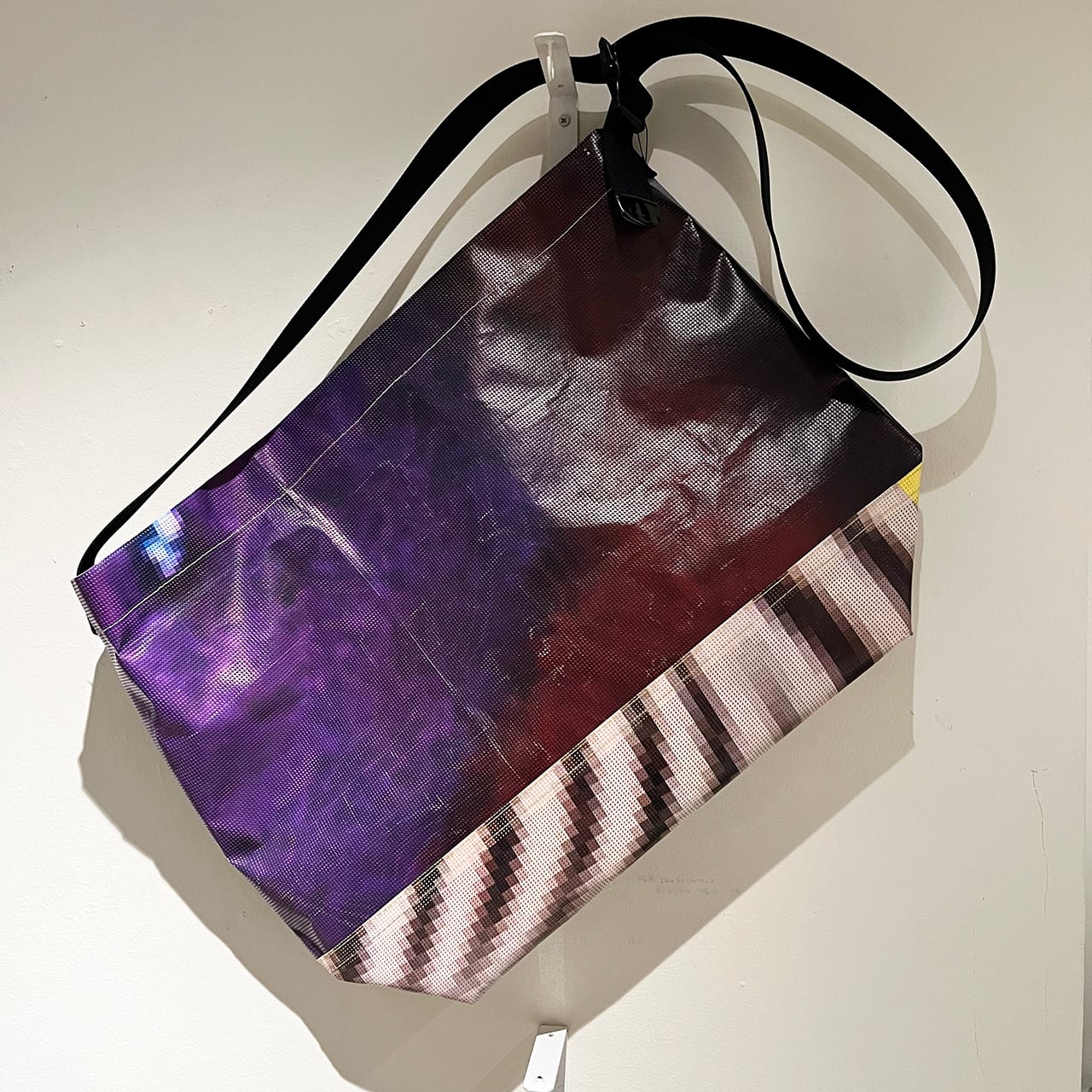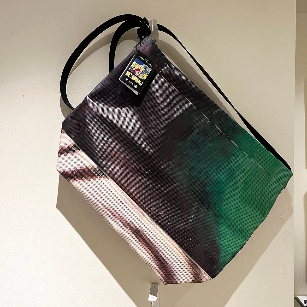 このバッグは、現場にかけられていたタープを再利用した100%リユース素材で製作されています。一点一点が全て異なる柄をまとったユニークなプロダクトになります。普段使いもしやすいベーシックかつタフなハンドメイドのスリングバッグです。