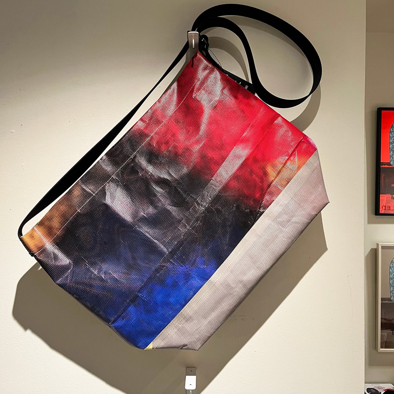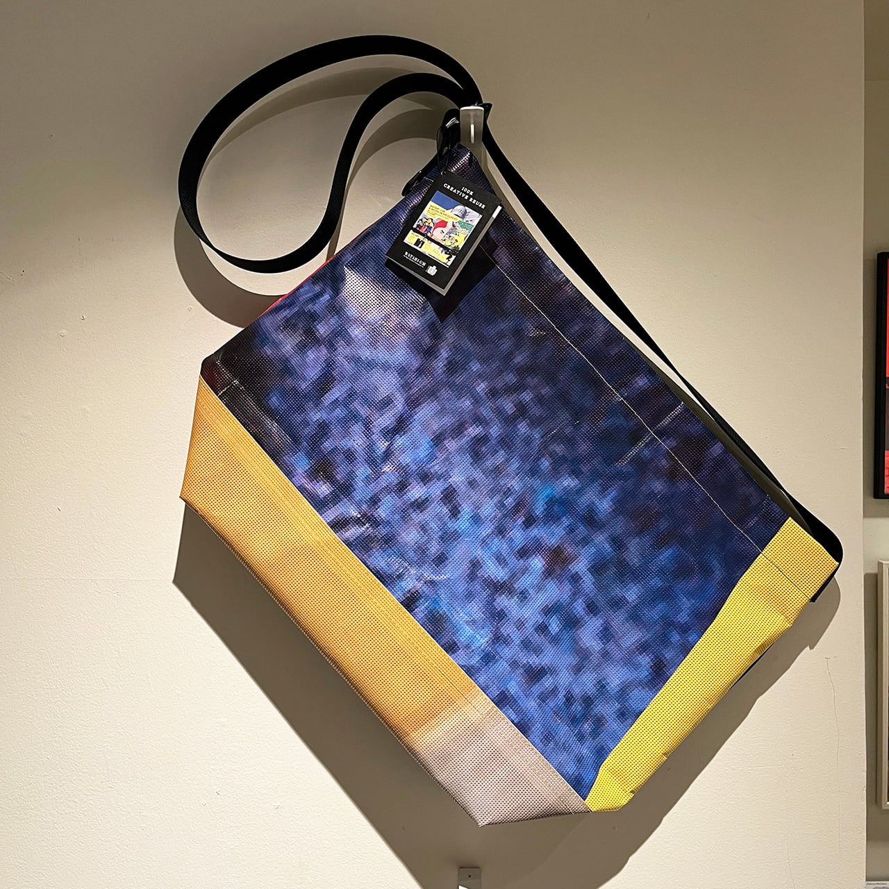 このバッグは、現場にかけられていたタープを再利用した100%リユース素材で製作されています。一点一点が全て異なる柄をまとったユニークなプロダクトになります。普段使いもしやすいベーシックかつタフなハンドメイドのスリングバッグです。