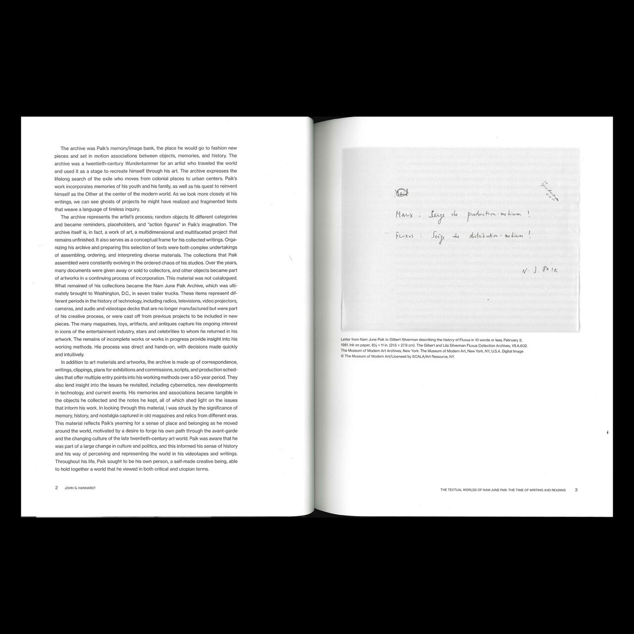 スミソニアン・アメリカン・アート・ミュージアムのナム・ジュン・パイク・アーカイブと国際的な出版物からの資料をもとに、「グローバル・グルーヴとビデオ共通市場」を含む重要であるにも関わらず長く入手できなかったエッセイ、チェリスト、シャーロット・ムアマンとの創作パートナーシップや公共テレビの役割などに関する未発表文章、編纂物「Scrutable Chinese」のかなりの部分など彼の先駆的放送作品の詳しい計画も掲載されています。『Good Morining Mr.Orwell』(1984年)、『Bye Bye Kipling』(1986年)、『Wrap Around the World』(1988年)など、画期的な放送作品の詳細な計画も紹介されています。また、約150ページにわたってパイクのオリジナルのタイプや手書きのページが再現されており、読者はインスピレーションと作品制作のさまざまな段階における彼の文章を目にすることができます。