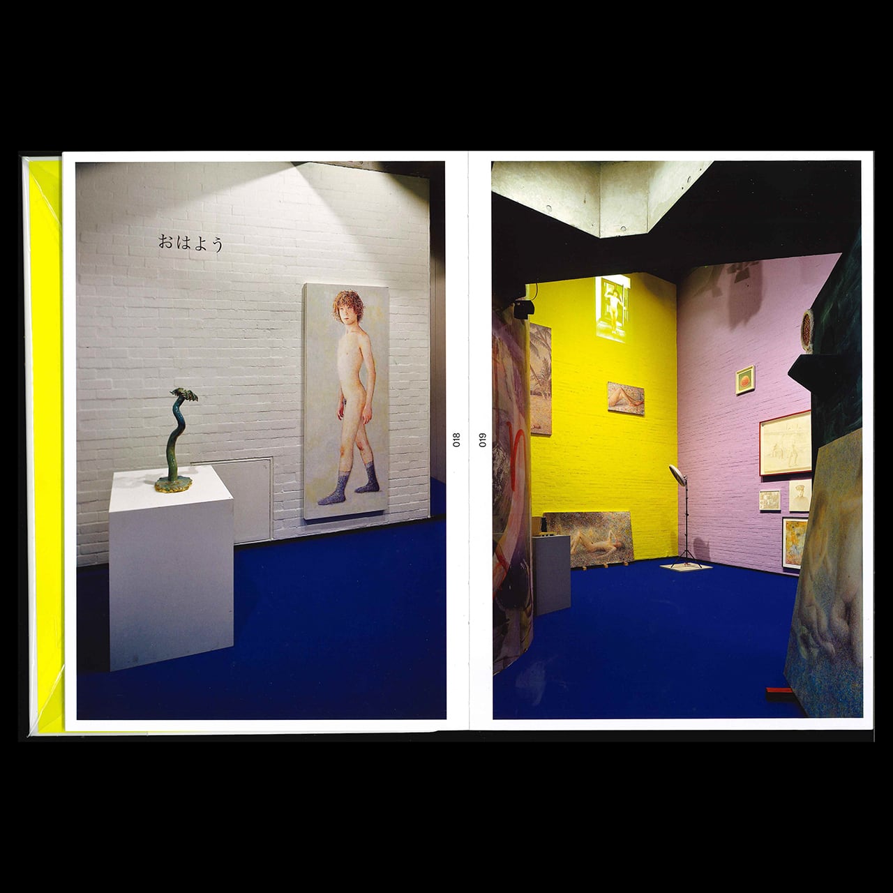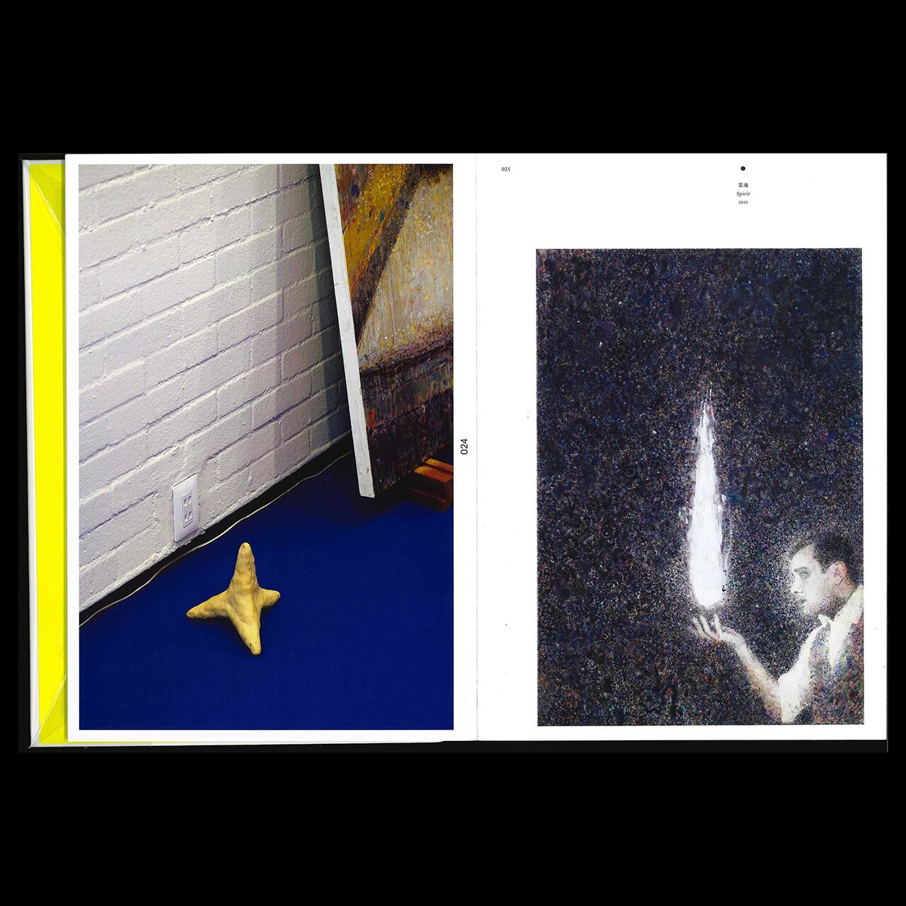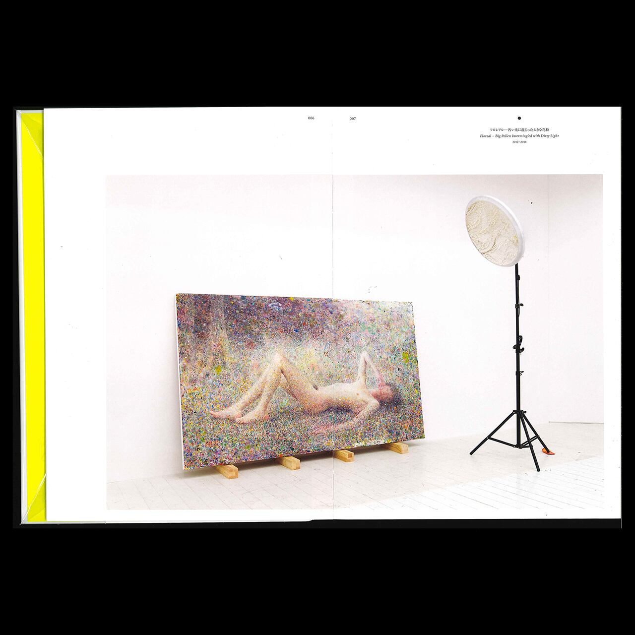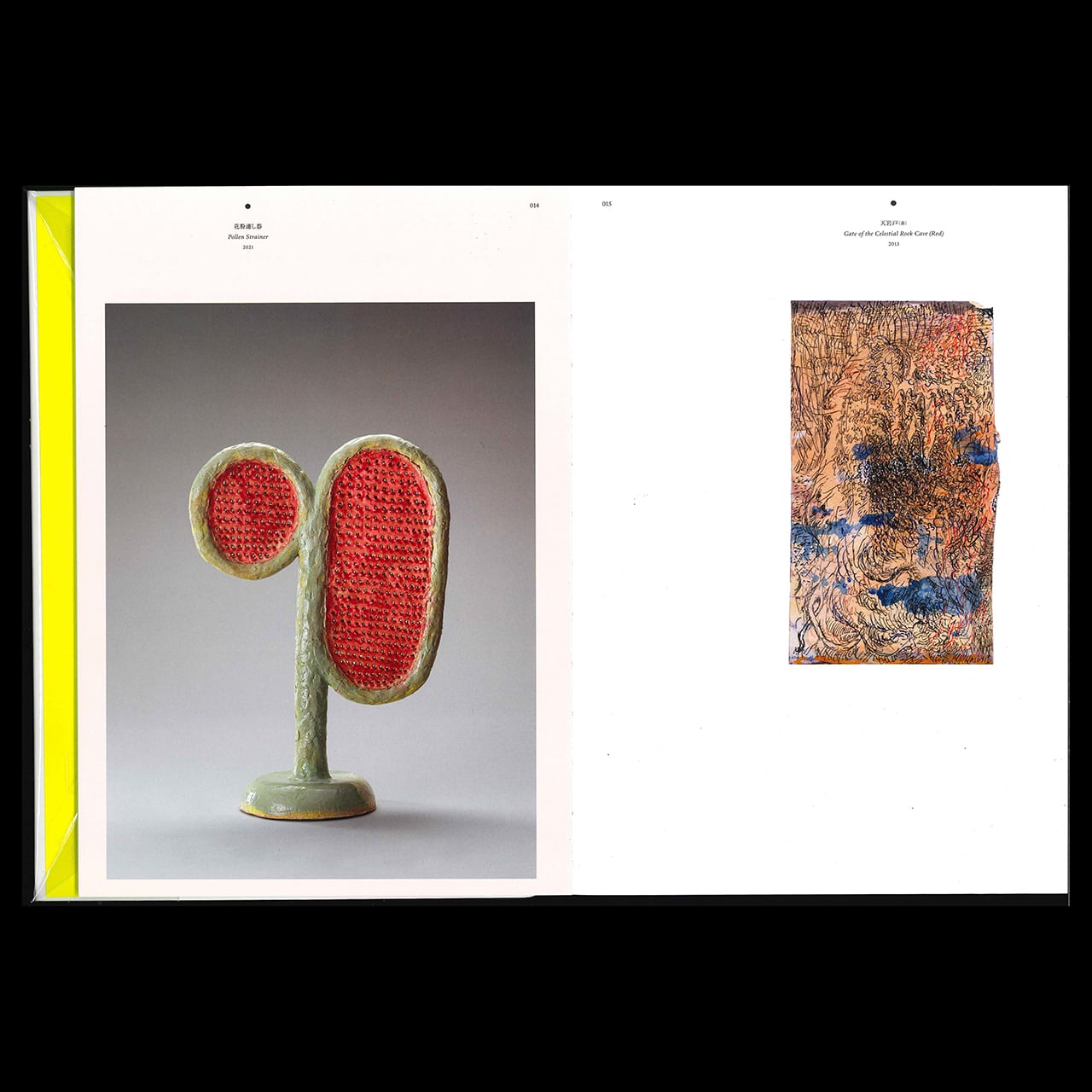 穴のあいたしおりと「梅津庸一展|ポリネーター」展示風景(撮影=畠山直哉)を印刷したしおりが重なりあって、表紙の上に置かれ、シュリンクフィルム包装されています。展示風景のしおりは2種類あります。また製本はスイス装という、本文(ほんもん=文書・書物の本体となる部分)に接着剤を塗り、ハードカバーの表紙に貼り合わせる方法。書籍がノドまで開きやすく、スプレッド(見開き)にレイアウトされた図版もフラットに見ることができるよう設計されています。