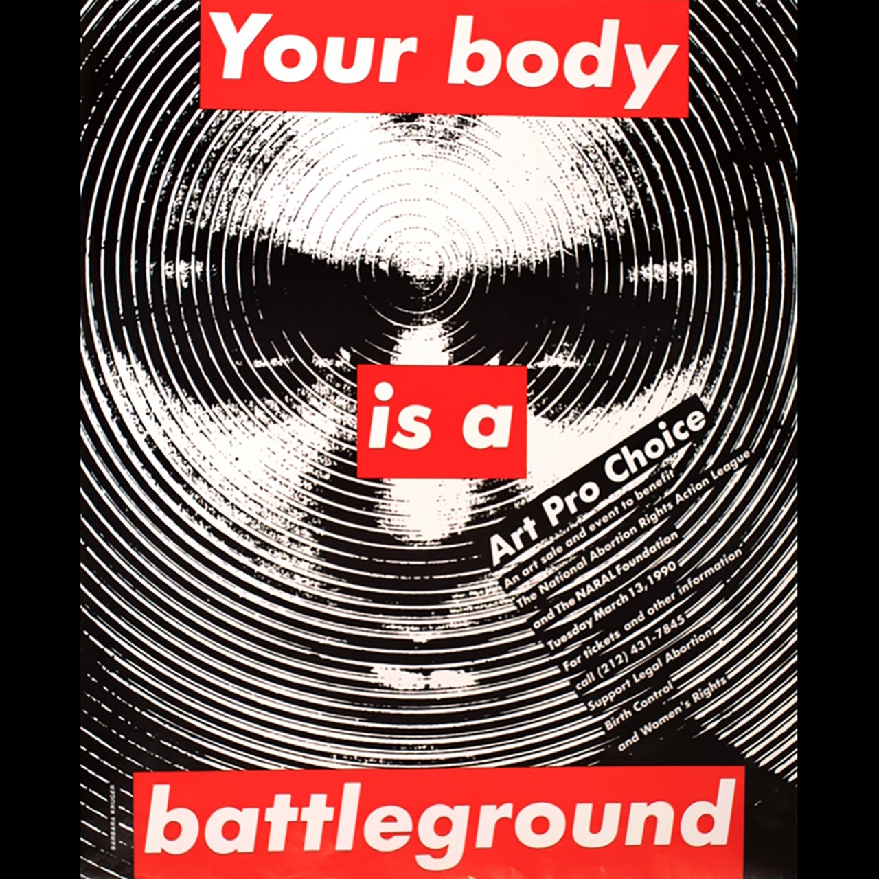 バーバラ・クルーガーの作品は、広告業界の巧妙な手法を告発するような大胆なグラフィックで知られ、フェミニスト活動家のシンボルになったものもある。この作品「Your Body Is a Battleground(あなたの体は戦場だ)」というテキストが、女性の顔の上にレイアウトされた白黒のコラージュ作品《Untitled (Your Body Is a Battleground)》は、もとは1989年にワシントンで行われた中絶の権利を主張する女性のデモのために制作され、その後フェミニストやクィアの抗議活動で広く使われるようになった。今回のグラフィックは、女性の顔を同心円のエフェクトで置き換えた2001年バージョンをアップデートした、ICAのインスタレーションのための作品。