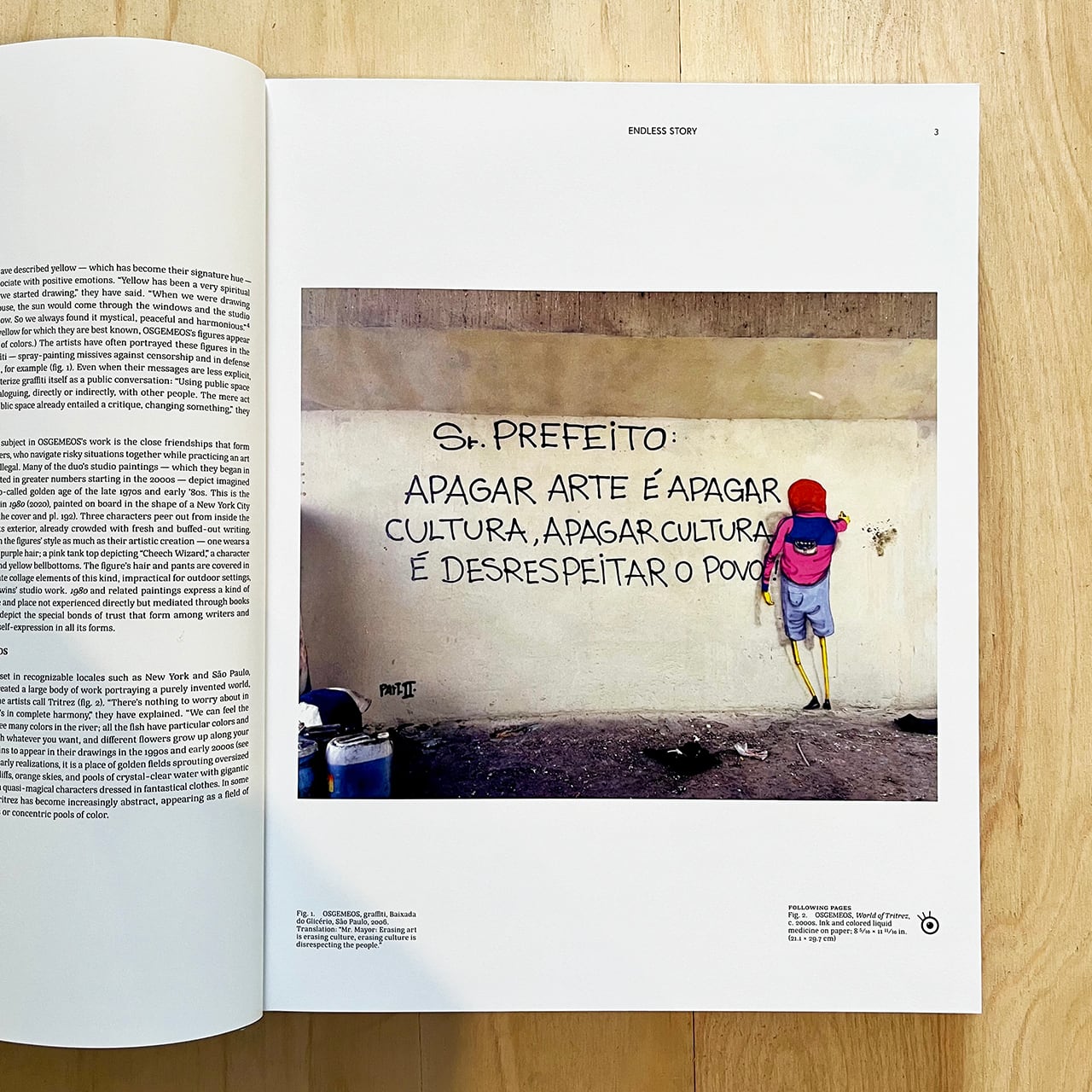本書は上述の作品を含む約350点の図版、展示風景の写真、アーカイブ資料、アーティストへのインタビューを収録し、ブラジルの都会で育った彼らの芸術的言語とその発展の軌跡を収録した一冊。アーバンアートとグラフィティの伝統、そして双子として宿命的に共有されるイマジネーションから引き出されたある種の魔術的な要素と、ストリートで彼らが見出した普遍的なテーマ、その双方を兼ね備えて圧倒的な支持を得ているオズジェメオスの遊び心に満ちた活動にスポットライトを当てている。また本書には、彼らへのスタジオでのインタビューを動画で視聴できるスマートフォン対応の動画サイト「Hirshhorn Eye video」への連携も付与されている。