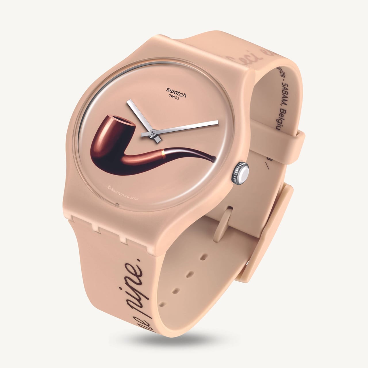 LA TRAHISON DES IMAGES BY RENÉ MAGRITTEは、マルチカラーの文字盤にプリントされているルネ・マグリットのアイコニックな作品「La Trahison des images(イメージの裏切り)」のディテールが見どころです。ストラップの表側には、マグリット作品のシュルレアリスム的な性質に引っかけて、"Ceci n'est pas une pipe.Ceci est une Swatch."「これはパイプではない。これはSwatchである。」というユーモアたっぷりの文句が記されています。ループにはこのアーティストの名前もプリントされています。